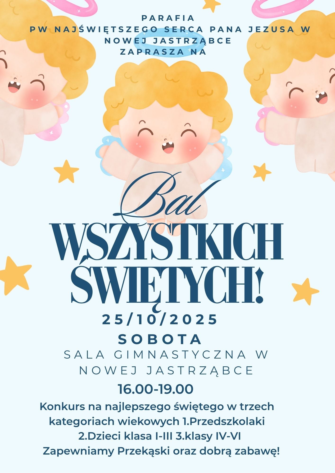 - Przypominamy, że w sobotę (25 października) odbędzie się „Bal Świętych” dla dzieci od przedszkolaków do VI klasy. Podczas balu konkurs na najlepszy strój świętego w trzech kategoriach wiekowych: 1. Przedszkolaki; 2. dzieci klasa I – III oraz; 3. klasy IV – VI. Bal odbędzie się na sali gimnastycznej w Nowej Jastrząbce, rozpoczęcie o godz. 16.oo zakończenie o godz. 19.oo. Serdecznie zapraszamy. Plakat poniżej ogłoszeń ↓