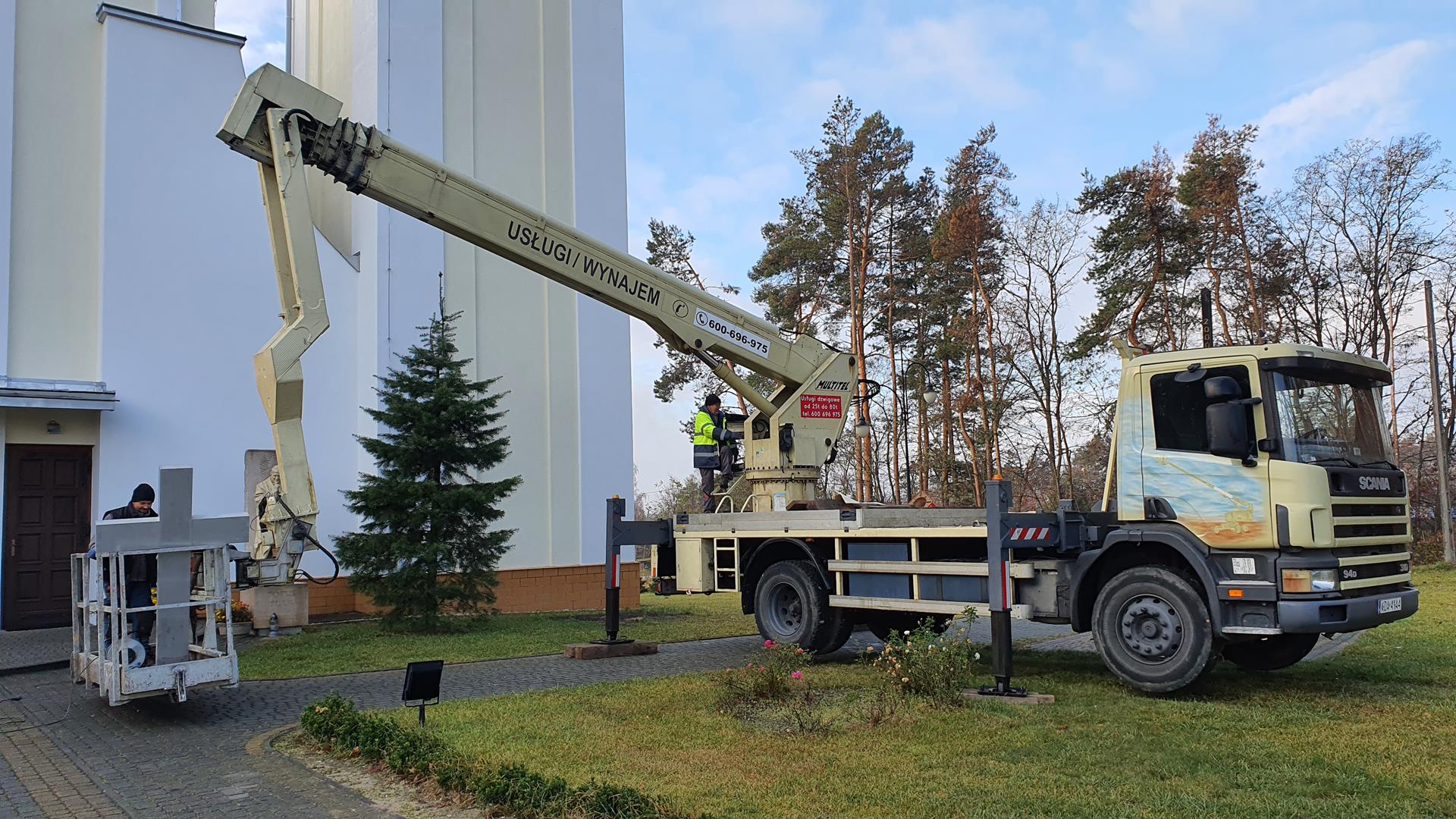 Montaż krzyża na wieży kościoła Matki Bożej z Guadalupe